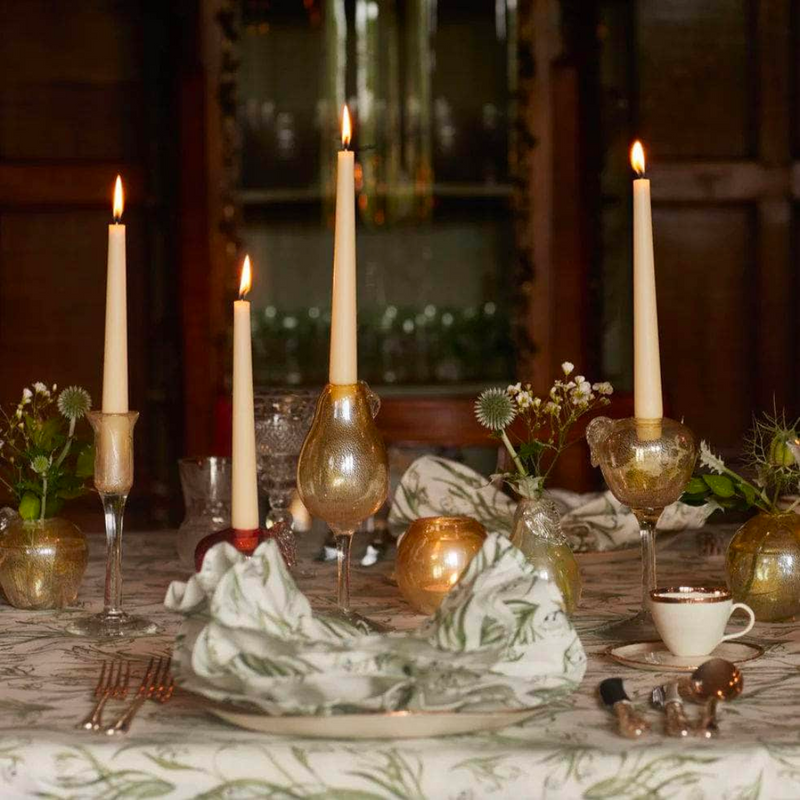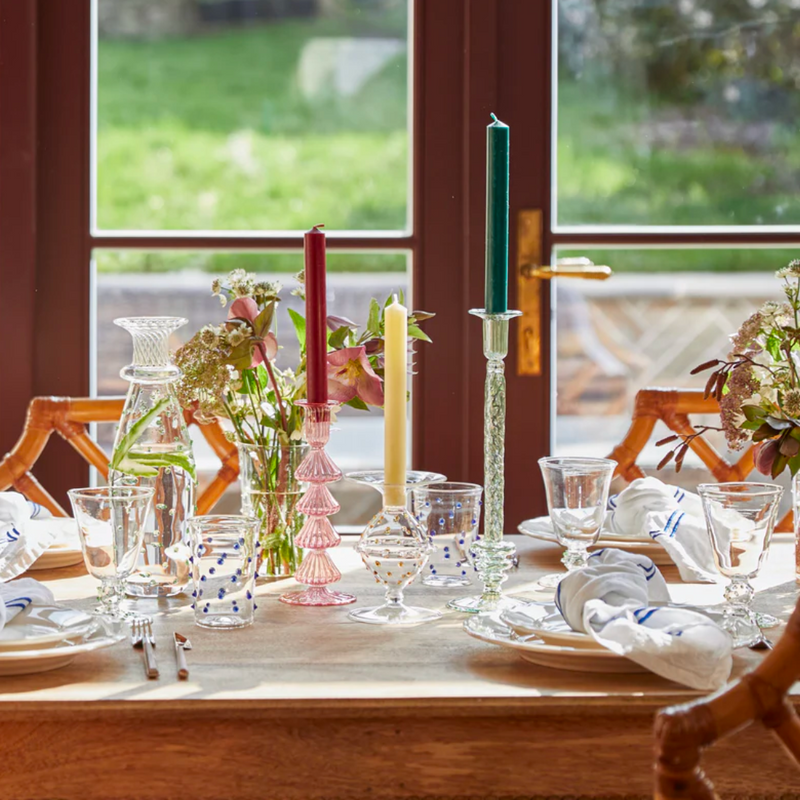 Ibbi's glass candlesticks are created for them in Egypt. Each piece is painstakingly hand blown, hand engraved and hand painted by their artisan partners and the small company, run by Rana and her team, have created the most striking collections of candlesticks for us since 2021. The result? As Rana says- a veritable feast for the eyes!