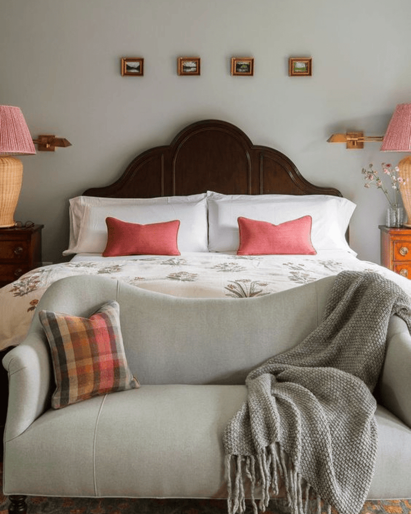 One bed, two bedside tables, four pictures and five pillows, creating a triangle.