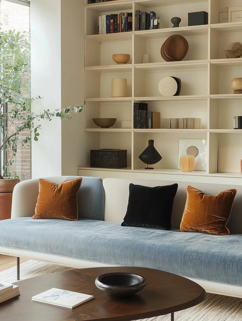 Glossy surfaces + soft fabrics = chef’s kiss. Think glass coffee tables paired with a velvet sofa or a sleek stone counter softened by wool cushions.