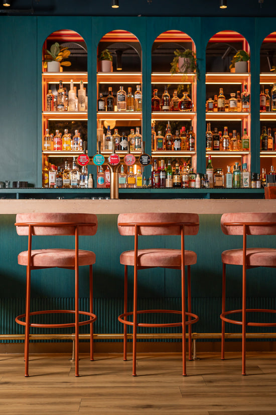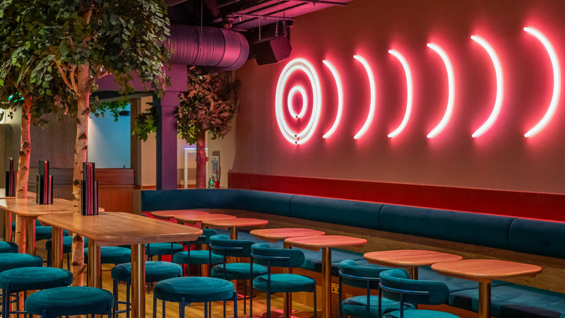 The breakthrough? Ditching the predictable browns and greens for unexpected pinks and teal (a clever nod to the actual clay targets!). By framing the technology with warm textures, lush foliage, and bespoke lighting that echoes the motion of a flying clay, the result is an immersive, elegant, and effortlessly social space that’s anything but a theme pub.