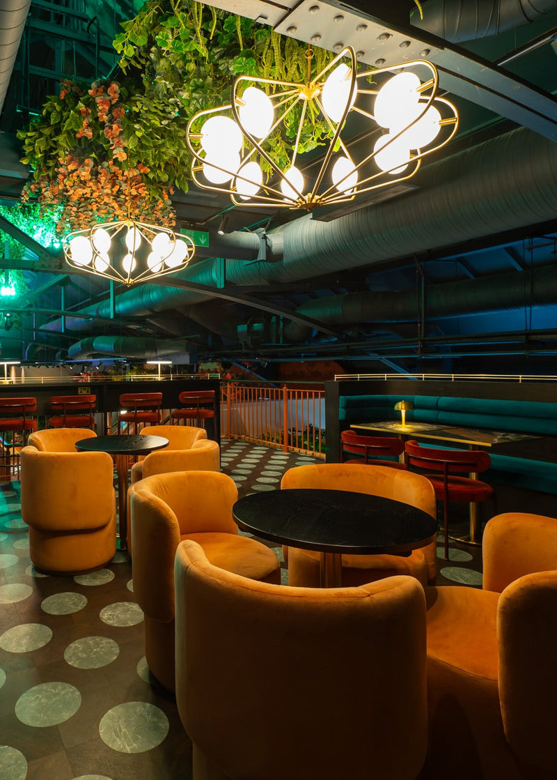 The foliage played a huge role in softening the architecture and anchoring the countryside inspiration. Bespoke lighting inspired by the arc and motion of flying clays brought a layer of storytelling without ever feeling literal. Tailored lounge seating and natural-toned upholstery made the venue comfortable for long social visits, while textured wall finishes added depth and warmth. Altogether, these elements shaped a space that feels immersive, elegant, and effortlessly social.