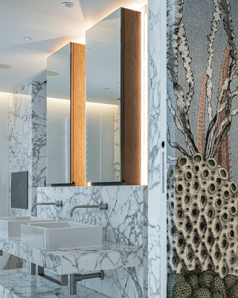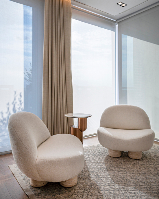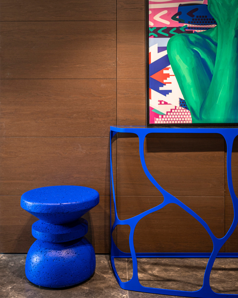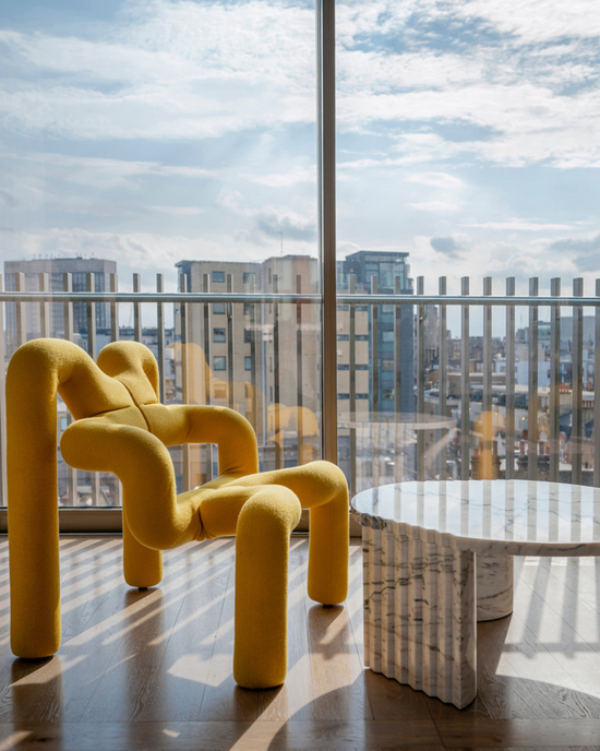 Objects became punctuation marks. A sculptural yellow chair vibrates against London’s skyline. A cobalt console interrupts walnut calm. A long, lean bench greets with theatre, not politeness. Even marble—so often a luxury cliché—was ribbed, cut, layered into play.
