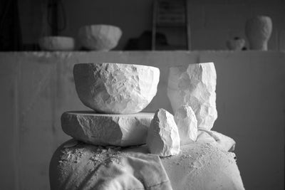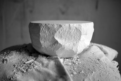 1882 Ltd.’s interpretation of black basalt, Crockery is a collection of fine bone china tableware slip-cast from plaster models carved by hand, with glazed interior for functionality and raw exterior reflecting the modest surface texture of the plaster original. Using the tools of a stonemason Lamb chips and carves a solid block of plaster to make a series of tableware, the design of each formed quite simply out of their own making.