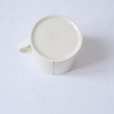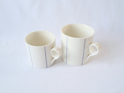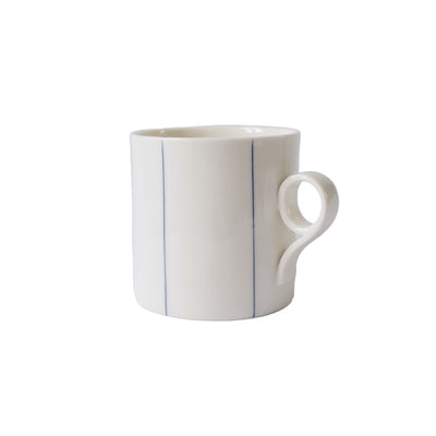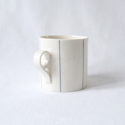 The Large Mug with Atelier Anglais's signature loop handle.  Cast in French hard-paste porcelain with fine, inlaid cobalt blue stripes and finished with a translucent glaze.