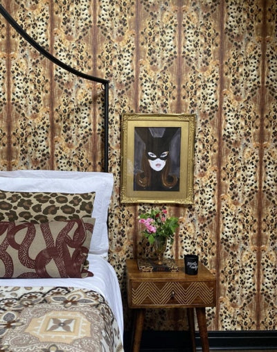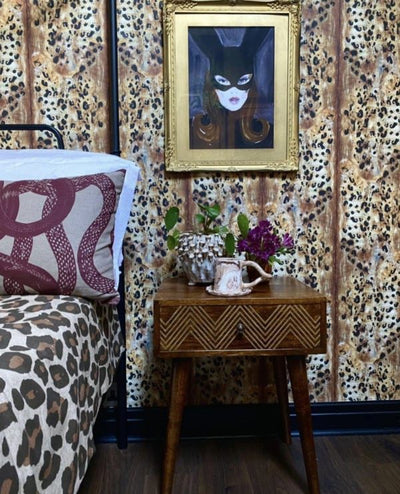 With a hand-painted appearance, this linear animal inspired design has a pretty and feminine quality, with touches of blue and flowers here and there. It looks beautiful with black furniture pieces.