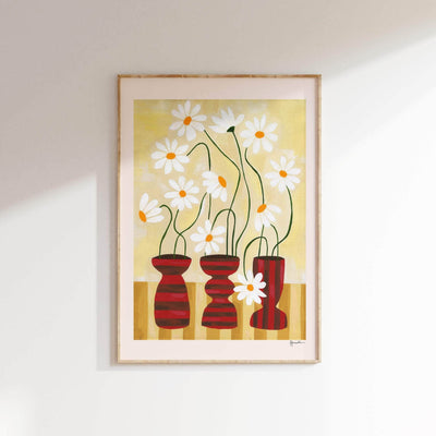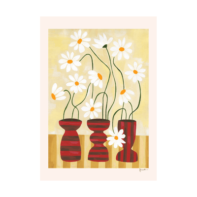 Mini vases with flowers are so much better than one big vase! I love the coloration of this one—the red and yellow together always work so well in any space. This piece was painted on handmade cotton paper using gouache and acrylic. It has been photographed at the highest resolution, preserving all the paint strokes and textures.
