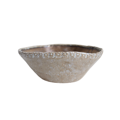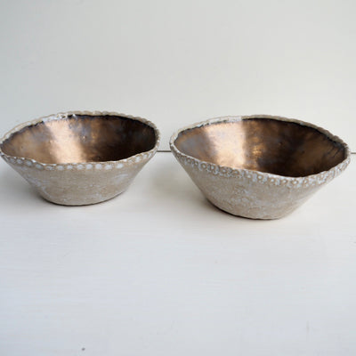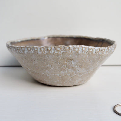 Finished inside with a beautiful gold/ metallic glaze, and on the outside with  textural speckled cream/white glaze .