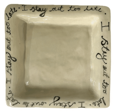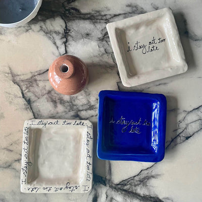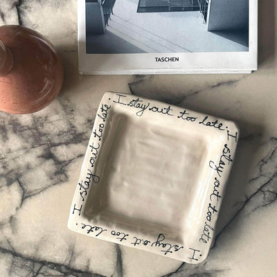 The I Stay Out Too Late Trinket Tray is a signature style for L&Clay Ceramics. A cream square ceramic tray for your keys, jewellery and trinkets, featuring text in black and green that reads "I Stay Out Too Late". Each piece is handmade and will differ slightly from the image, remaining unique and beautifully wobbly.