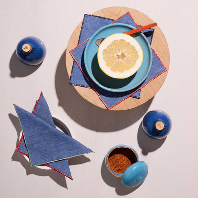 Catch the fun-sized vibe with the Beach Ball Appetizer Napkins! Larger than a cocktail napkin, smaller than a dinner napkin—perfect for wrapping drinks, serving snacks, or packing for a beach picnic. Made from soft Indigo Chambray with vibrant Agave Green, Picante Red, Orange Crush and Ocean Blue trim, they add a burst of color and playful personality to any gathering!