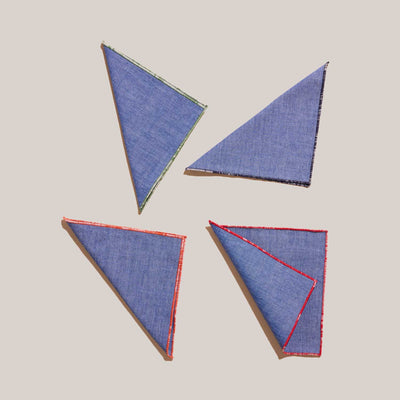 Size: 7” x 7” 4-piece cloth napkin set 100% premium reclaimed fabric Made in USA Care Guide: Wash cold, lay flat to dry, press with low iron while damp