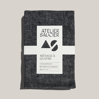 Size: 17” x 17” 4-piece cloth napkin set 100% premium reclaimed fabric Made in USA Care Guide: Wash cold, hang dry, press with low iron while damp