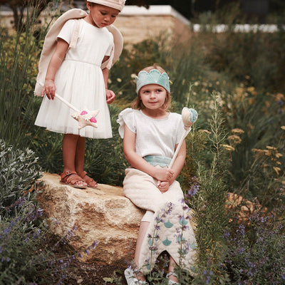 Transform your little one in to a magical, mythical sea-creature with this stunning Mermaid dress up set. Made from organic cotton canvas and velvet, and embellished with sparkly embroidered details, this elegant 3 piece set contains a sea-blue velvet crown, pretty shell wand with a pop out pearl, and beautiful wrap around tail. With velcro adjustable straps on the crown and tail, this versatile set is designed with love and made for passing down.