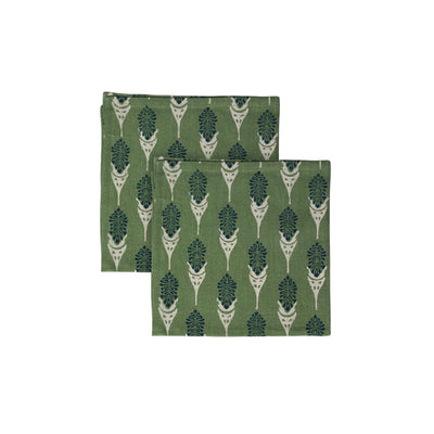The Bahaar napkins draw inspiration from Mughal artistry, hand-block printed with larkspur motifs in ink blue and ivory on an oil green base. Crafted in pure cotton and finished by hand, they add elegance and versatility to both everyday tablescapes and festive dining.