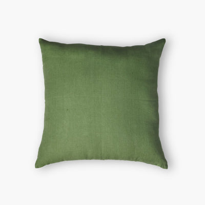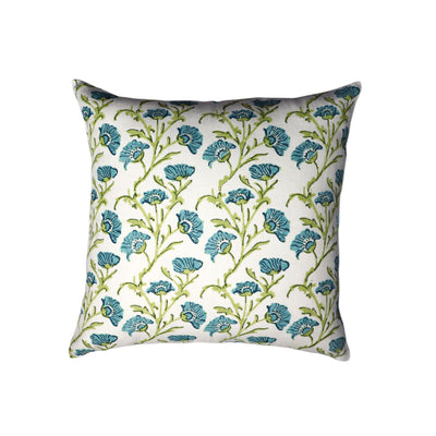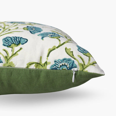 The Bella pillow cover is inspired by India's gulmohar flower, hand-block printed with vine and floral motifs in a calming blue and green shade. Crafted in pure linen, it features a solid olive green reverse for versatile styling. Finished with a concealed zipper and pre-washed for softness, it brings fresh elegance and timeless charm to any space.