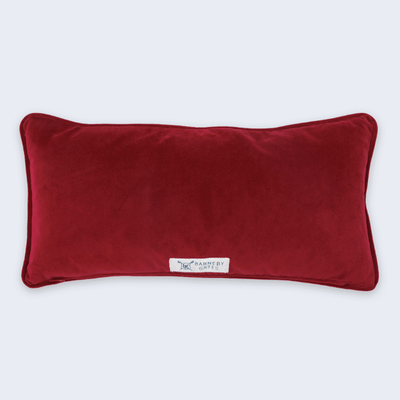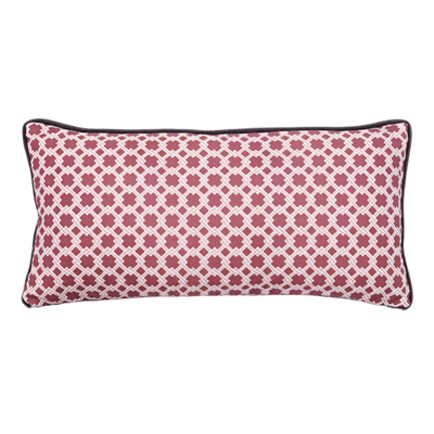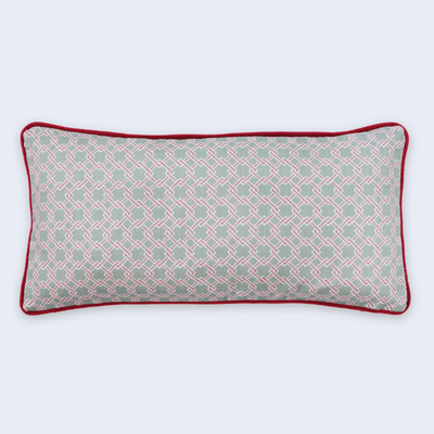 A small-scale inter-linked geometric design, our Lattice Cane cushions are available in Light Olive/ Red with red velvet piping and reverse, and in Red/Pink with charcoal velvet piping and reverse. Each cushion comes with a feather pad and concealed zipper.