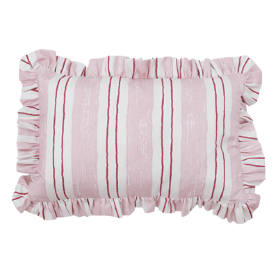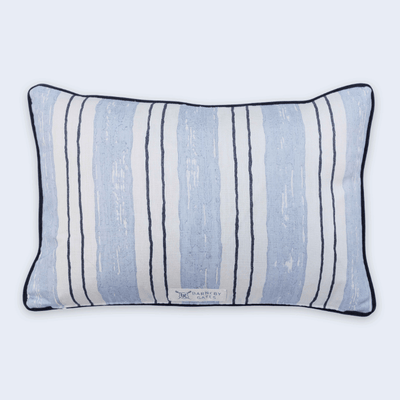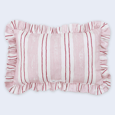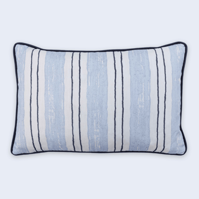 Barneby Gates' take on a classic stripe with a lovely wide brush stroke with a painterly feel flanked by a double row of hand-drawn pinstripes. These rectangular cushions are printed on both sides and available in pink with a 5cm self-frill, or in blue with dark blue velvet piping. Each cushion comes with a feather pad and concealed zip.