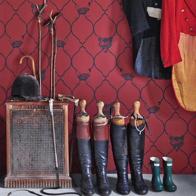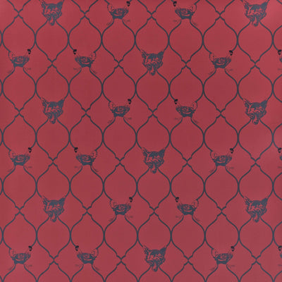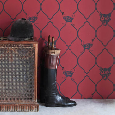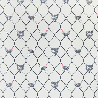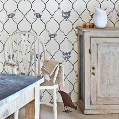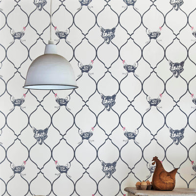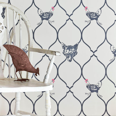Two sworn enemies in one quirky print: the fox and the hen come together on a chicken wire-inspired trellis.