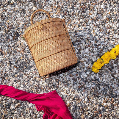 This handwoven three-tier stacked storage box is based on a traditional tiffin. Perfect for storing cosmetics, sewing knick-knacks or dry food items - or simply as a decorative piece.