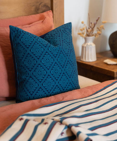 This cushion has been handwoven for over 55 hours using a traditional and intricate hand brocade technique. This zero waste design, which is deeply rooted in mayan culture, transcends their spiritual belief that each point of a diamond represents the path of the sun each day. Quality in every stitch, style for every season.