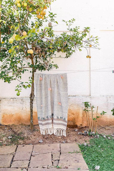 This blanket features multiple weave variations, combined with fun textured tassels throughout the blanket. Ending with gorgeous macramé accent knots for the ends, this elegant, yet playful blanket is a beautiful luxurious ethical blanket to enhance any bedroom or living space.