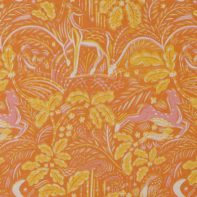 ‘Staffordshire’ is inspired by Beki’s love of antique Staffordshire ceramics. Fascinated by the animals, foliage, colours and the naive form of painting used, Beki has recreated their magical quality giving them their own sense of freedom away from their ceramic stands. ‘Staffordshire’ depicts an abstract wild woodland scene, in which the deer can leap freely around oak leaves and ferns. By playing with scale and placement, Beki creates a dreamlike quality inviting the viewer to immerse themselves in a delightful world of texture, colour and pattern.