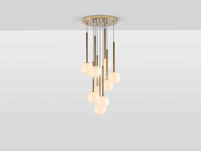 Brighten your living spaces with this brass cluster ceiling light, a sophisticated centrepiece for contemporary homes. The reflective ceiling rose suspends nine adjustable opal glass shades, providing a soft, ambient glow for a warm welcome where you need it most. This is the perfect fitting for high ceilings and narrow spaces, so let it shine in your hallways or above your staircases.