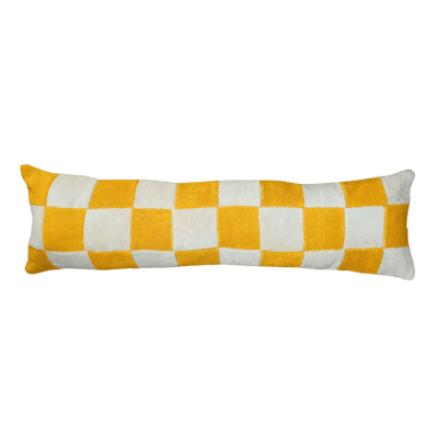 A handmade bolster cushion, made with 100% organic cotton in yellow and ecru from deadstock Tawul towels and in the ELDORADO The studio signature chequered style.