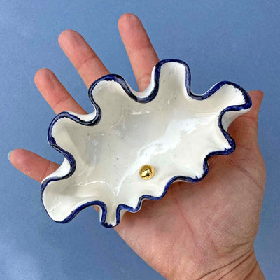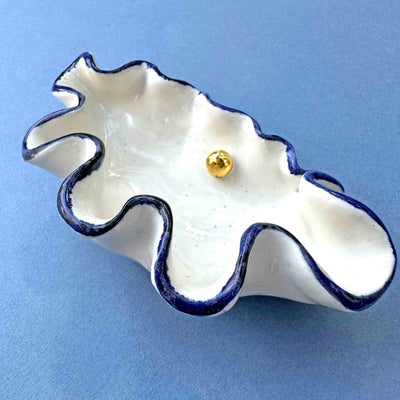 A clam shell shaped pinch pot dish designed to hold seasonings or treasures