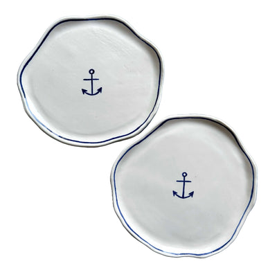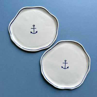 Pair of irregular shaped anchor plates made from porcelain and decorated with cobalt anchors and a blue stripe edge.