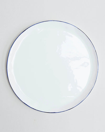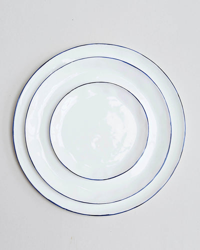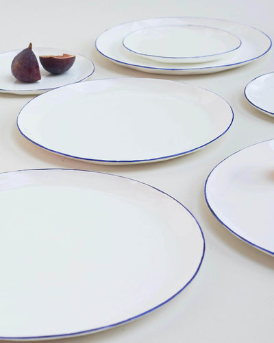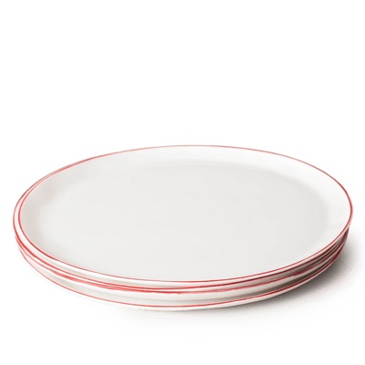 The new collection of plates are designed to sit together or alone - each with a shallow dimpled lip and a sketch-like hand painted band in a deep Cobalt, a bright Geranium red, elegant Forest Green or 24ct gold to contrast with the bright white of the fine bone china, brought out by a high gloss transparent glaze. All handmade in Stoke-on-Trent.