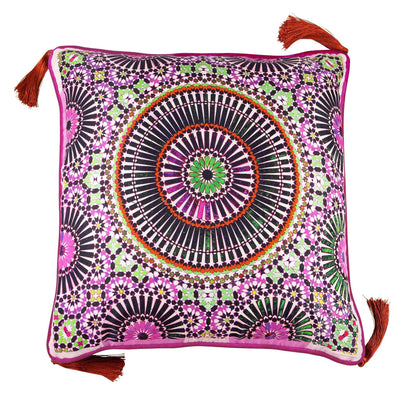 The silk Zellige Ispahan tasselled cushion is a colourful play on the famous Moroccan terracotta tileworks, with coloured circle overlays on the zellige design. Irregular shade variations and geometric flaws in the tiles give character to the pattern. Celebrating the mosaics' rich history and craftsmanship and made from silk twill and cotton viscose velvet, the Zellige Ispahan cushion's colourful mosaics add a splash of Moroccan cool to your living room. Comes in three colourways. Can be used as floor cushion or oversized cushion.