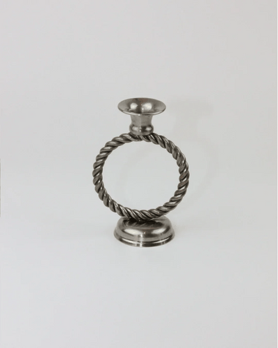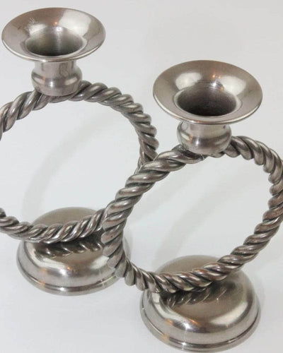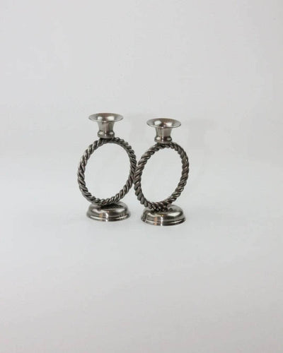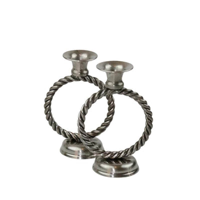 Elegant pair of metal candleholders with a timeless design. Their circular base and braided upper ring give them a classic and sophisticated air. Ideal for adding a touch of romance and warmth to any setting.