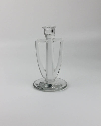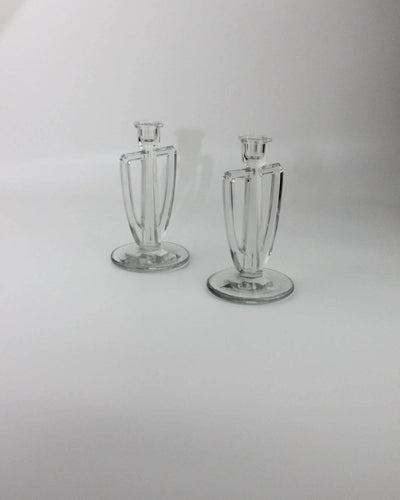Elegant pair of clear crystal candleholders that capture the essence of Art Deco design. Their straight lines and geometric shapes create a sophisticated contrast with the delicacy of the crystal. The circular base and shield-shaped body give them a minimalist and timeless air.