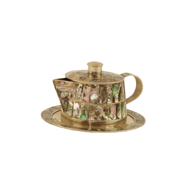 Small vintage nickel silver jug ​​inlaid with handmade abalone pieces, circa 1950 to 1960. Includes base plate for service.