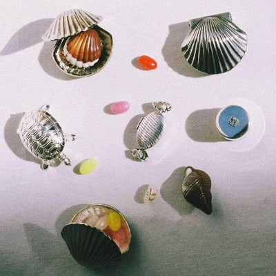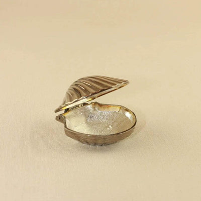 Vintage pill box in the shape of a seashell, made of nickel silver. Well preserved item, with slight patina of time