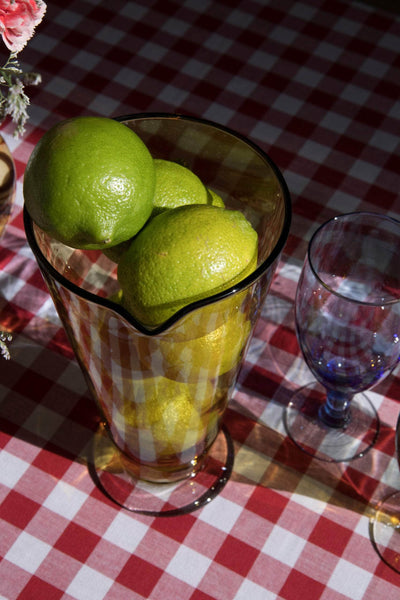 Glasses: H 17.9 cm x mouth diameter 6.7cm x base diameter 6.8cm Pitcher: H 25.1cm x Diameter mouth 13.2cm x diameter base 9.4cm