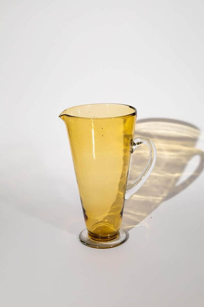 Elevate your table setting with this unique vintage multicolour pitcher and glasses set. Features elegant, colourful glass with a tall amber yellow pitcher and six stemmed glasses in different colour tones: light and dark green, light and dark blue, amber yellow and smokey brown.