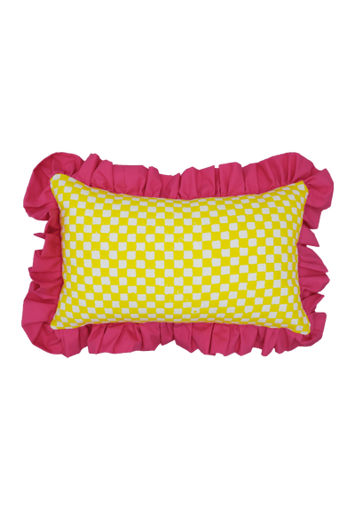 Yellow and White Checkerboard with Ruffle Detail Cushion | Square