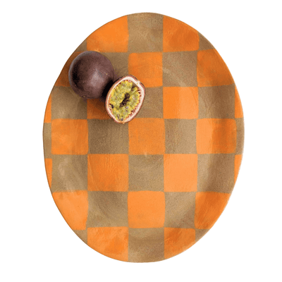 An organically-shaped, irregular stoneware Orange Check Oval Platter ready to brighten up your dining tables for any occasion. Designed and made by Rosie Gore in her London studio.