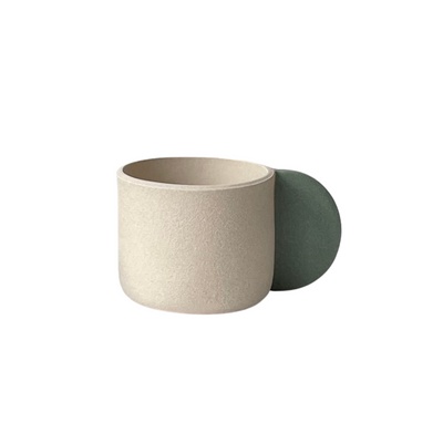 Textured stoneware exterior, with a transparent gloss glaze on the interior and a dark green glazed handle.