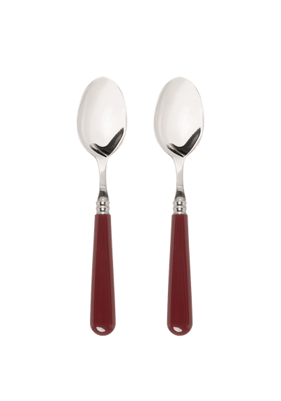 A set of 2 stainless steel dessert spoons with a burgundy handle.