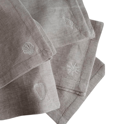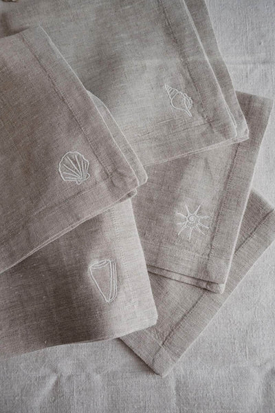 These shell embroidered linen napkins are made from premium linen in Europe. They come in a set of 4 with each napkin featuring a different shell embroidery.