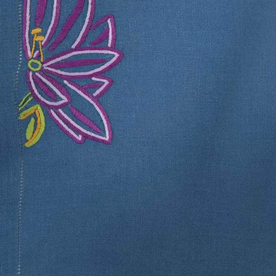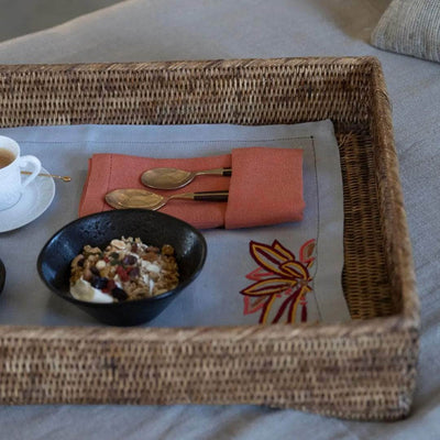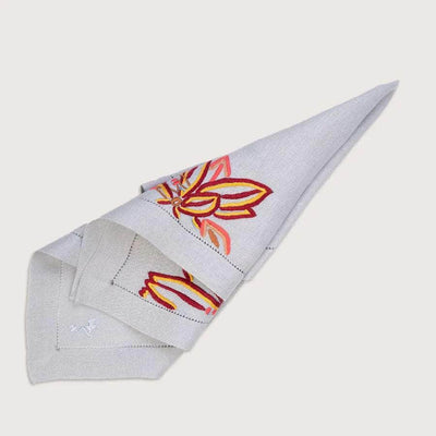 A placemat with the central motif on display, these colourful hand-embroidered placemats create a sophisticated and uniform table-scape, the perfect individual backdrop to any meal. With each motif taking fourteen hours to complete, and each meter of open hem two hours to prepare, the artistry behind each design is significant.