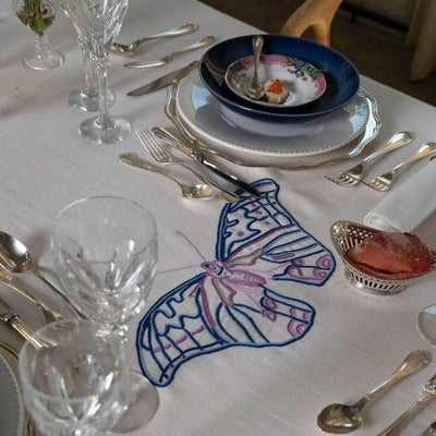 Hand-embroidered with open hems, Campante's linen tablecloths provide the perfect backdrop for any setting. With each butterfly motif taking fourteen hours to complete, and each meter of open hem two hours to prepare, the artistry behind each design is significant. Style with contrasting-coloured ceramics and delicate floral arrangements for a chic, maximalist aesthetic.