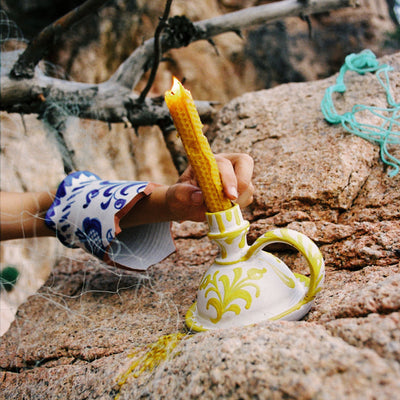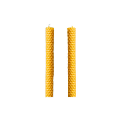 This set of two beehive candles, crafted from 100% pure beeswax, is perfect for adding a warm touch to any table setting. Handcrafted by artisans in Valencia, these candles are literally cleaned and rolled honeycombs, filled with extra beeswax for a slower burn. Their honey scent transports you to a sunlit garden, perfect for dining without overpowering the aromas of your menu.