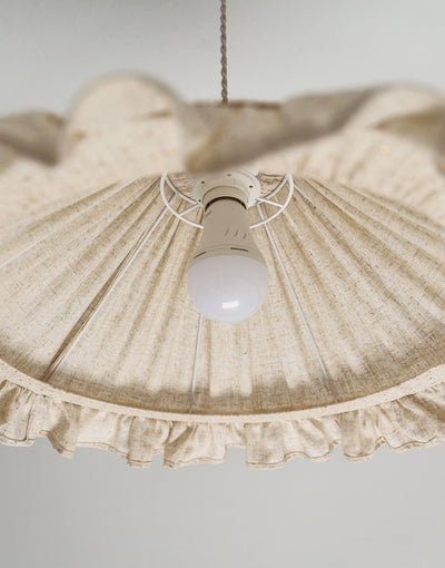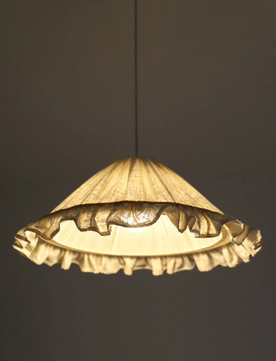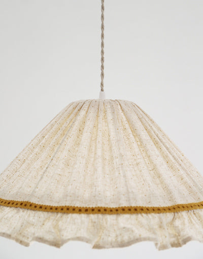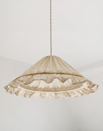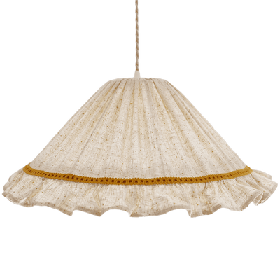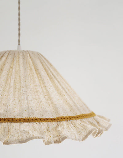 This delicate pendant light features a conical shade covered in a linen–cotton fabric printed with tiny golden polka dots on a natural linen background and finished with a charming ruffle. The material diffuses a gentle, enveloping light, blending timeless charm with modern elegance. Perfect for a dining room, bedroom, or cozy corner, it creates a refined and original atmosphere.