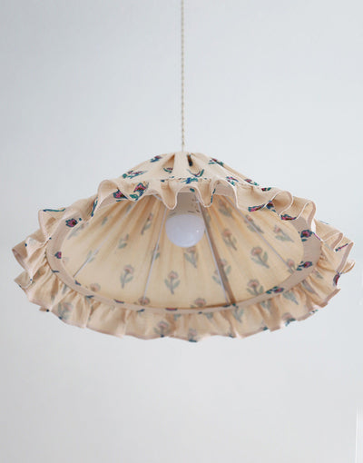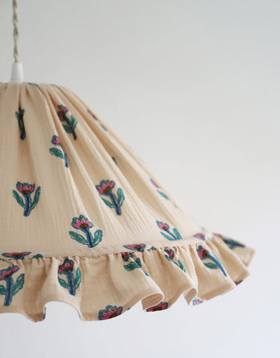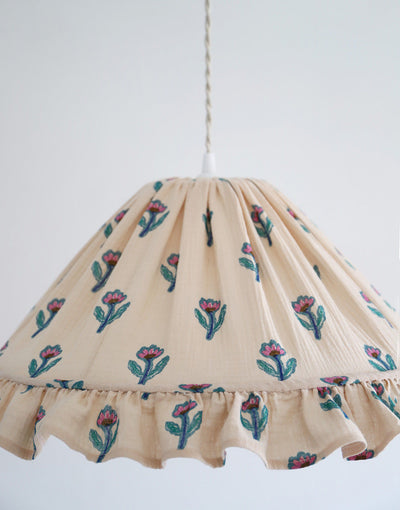 This delicate pendant light features a conical shade wrapped in cotton gauze printed with small sketched flowers on a nude background and finished with a pretty ruffle. The fabric gently diffuses a soft, enveloping light, blending timeless charm with modern elegance. Perfect for a dining room, bedroom, or cozy reading corner, it brings a refined and original atmosphere to any space.