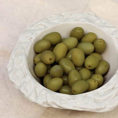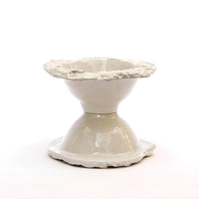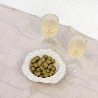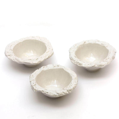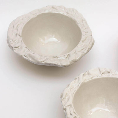 White stoneware bowls. The edges of the bowls have been textured with pebbles that were collected from the Samena calanque in Marseille. Each bowl's edge is different and irregular. Entirely handmade.