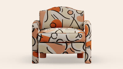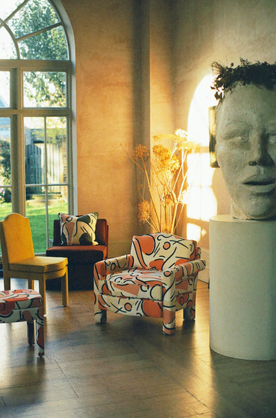 Ceraudo's Elio armchair is inspired by both modern and traditional silhouettes. We wanted to design a shape that exposes the key parts of its structure and provides a simple canvas for the upholstery to do all the talking. The inclusion of a traditional camelback detail also softens the structural aesthetic. The curved lines and soft edges were designed to complement the painterly Orpha print, however the style works equally well with a plain or simple print fabric.