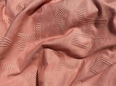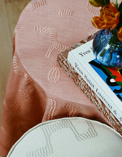 Featured here in our embroidered Raphia fabric in Clay, made with 100% cotton.